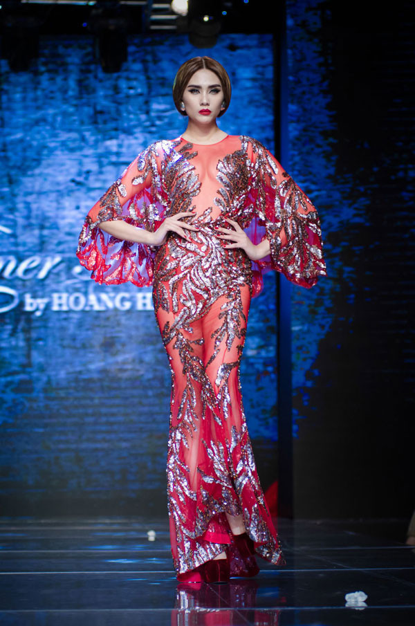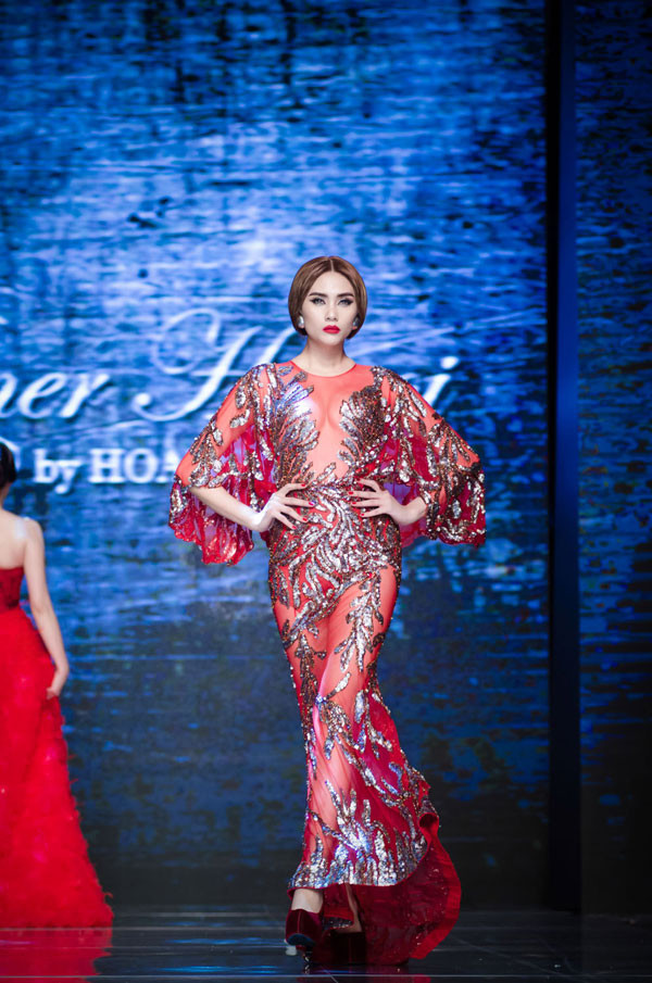 Hoàng Yến xuất hiện kiêu sa và đầy bí ẩn trong bộ đầm dạ hội đỏ rực, lấp lánh.