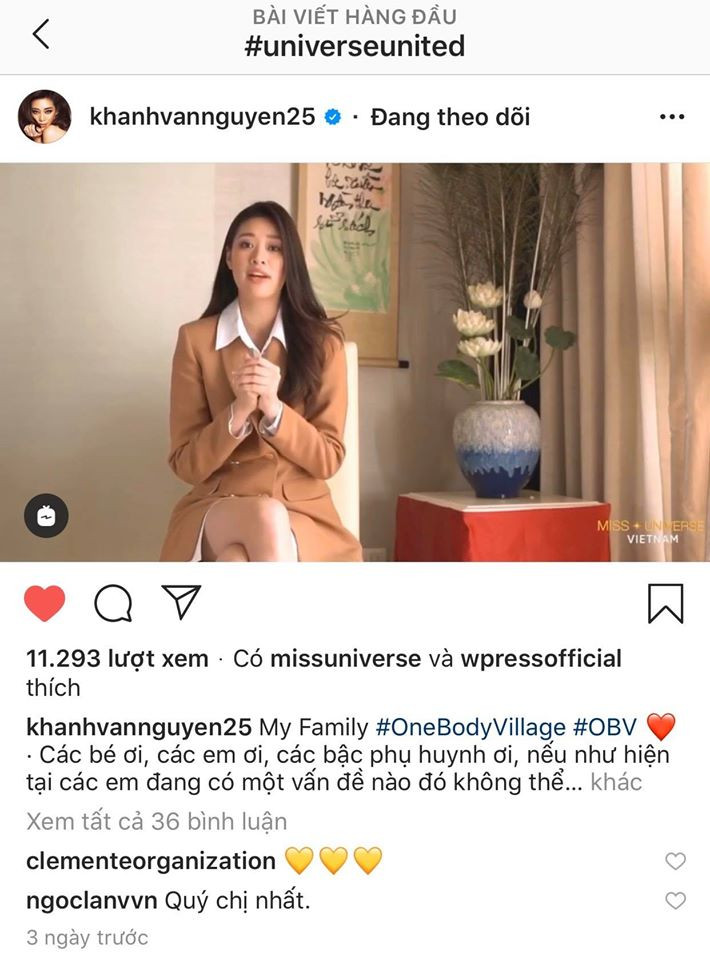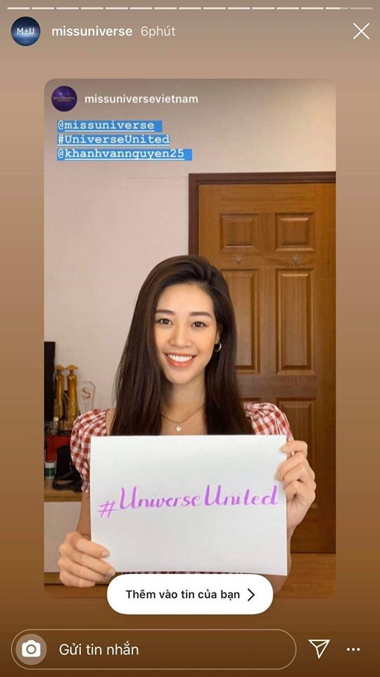 Trên trang cá nhân, Hoa hậu Khánh Vân đã hưởng ứng chiến dịch #UniverseUnited nhằm kêu gọi cộng đồng bảo vệ sức khoẻ phòng chống dịch bệnh virus Covid-19 do tổ chức Miss Universe khởi xướng.