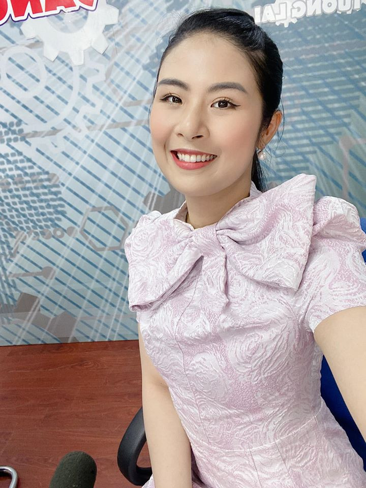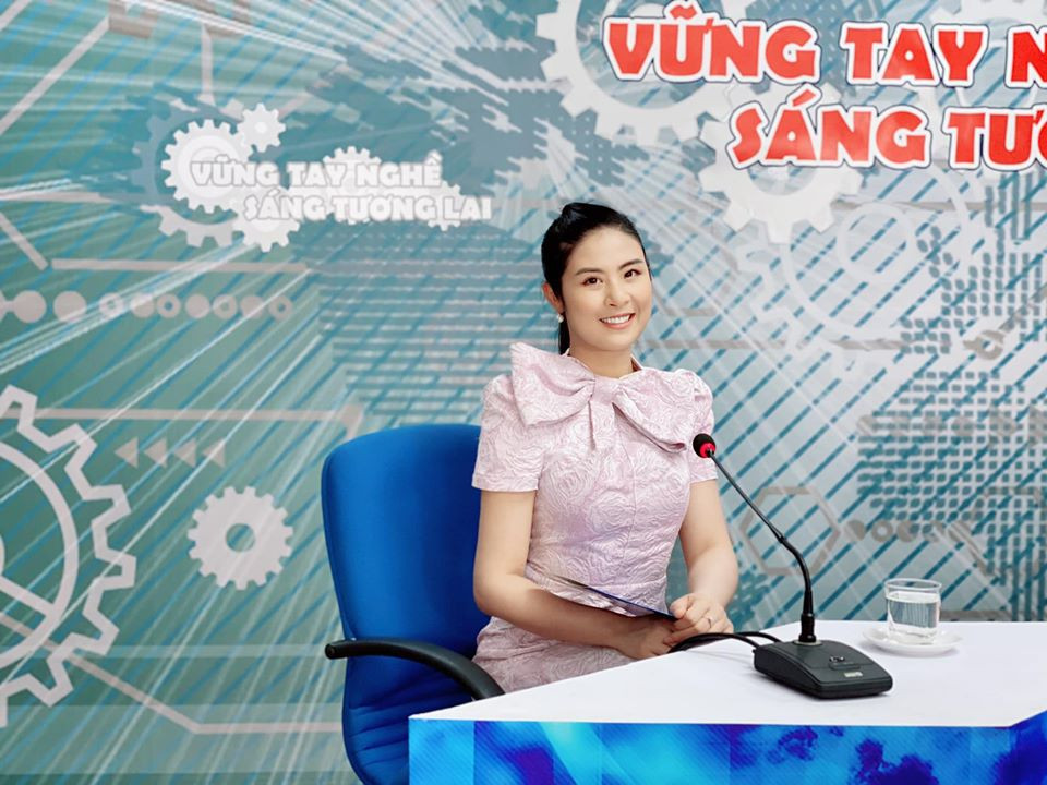 Hoa hậu Ngọc Hân diện set đồ màu hồng nữ tính khi tham gia chương trình "Hò hẹn với đoàn" chủ đề "Vững tay nghề - Sáng tương lai".