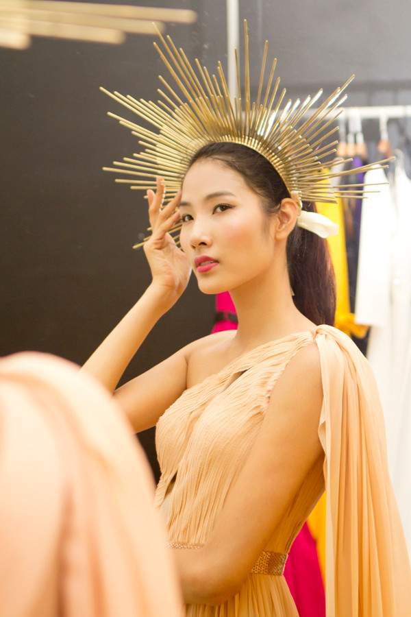 Để thể hiện trọn vẹn ý tưởng của bộ sưu tập, Lê Thanh Hòa đã đặt làm những chiếc vương miệng và phụ kiện màu vàng ánh kim đặc biệt với họa tiết đôi cánh đại bàng thể hiện quyền lực và sức mạnh.