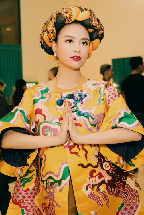 Hoàng Thùy Linh diện trang phục gấm cùng tạo hình cầu kỳ cho màn trình diễn.