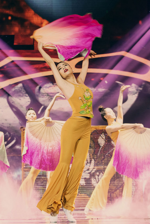Bài múa quạt của cô trong trang phục áo yếm tạo được hiệu ứng mạnh về mặt hình ảnh