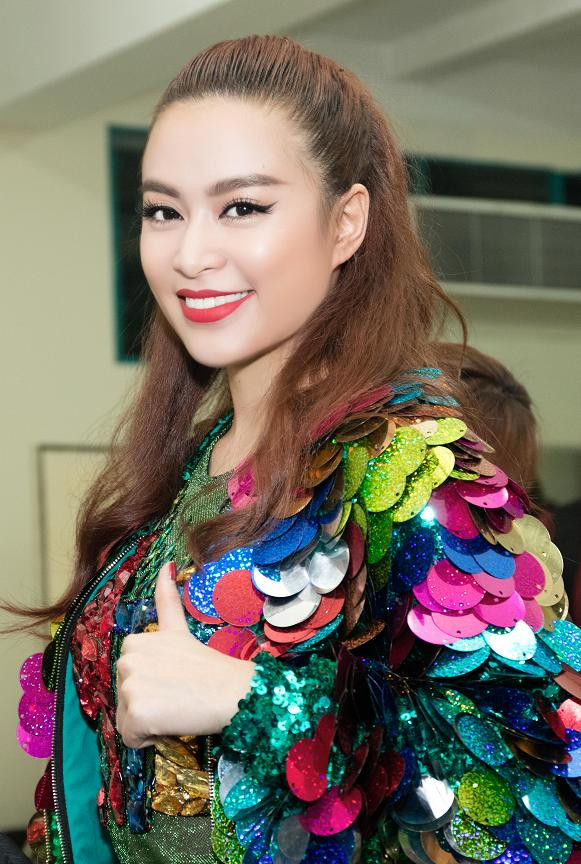Nữ ca sĩ thay trang phục biểu diễn rực rỡ và bắt mắt để chuẩn bị cho phần thi cuối cùng của mình trên sân khấu.