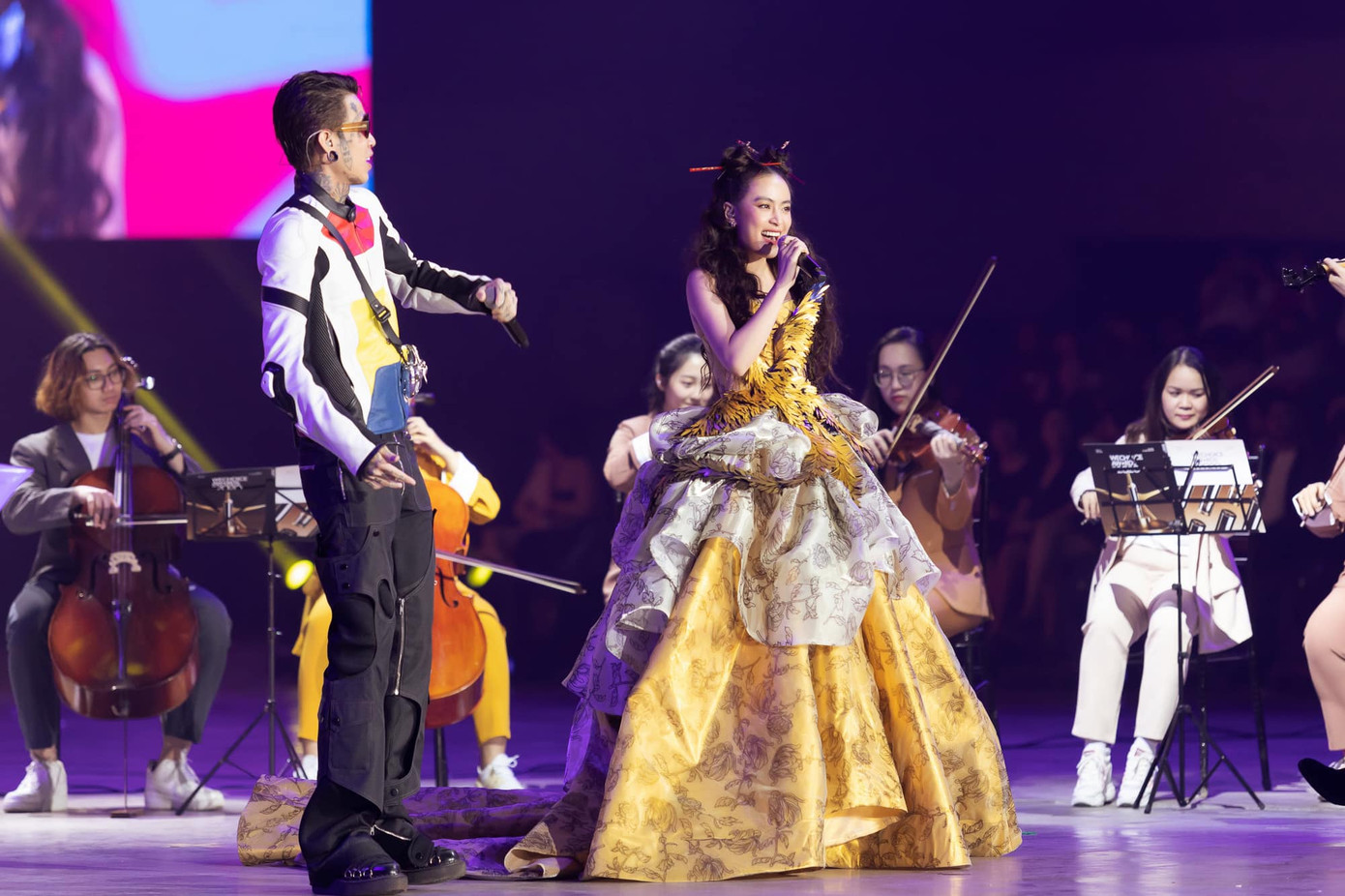 NTK Nguyễn Tiến Triển chia sẻ với Hoa Học Trò: “Đây là sản phẩm được sáng tạo cùng ý tưởng của stylist Hoàng Ku, đúng với hình ảnh chim phượng hoàng tôn vinh nữ ca sĩ. Theo đó, tôi đã dùng hơn 40 mét vải tơ, xử lý kết hợp chồng lớp với nhau tạo hiệu ứng layer, mang đến sự bồng bềnh, ấn tượng dưới ánh đèn trên sân khấu lớn…”