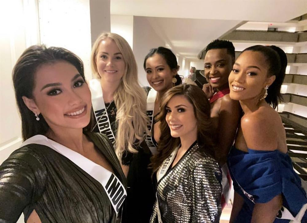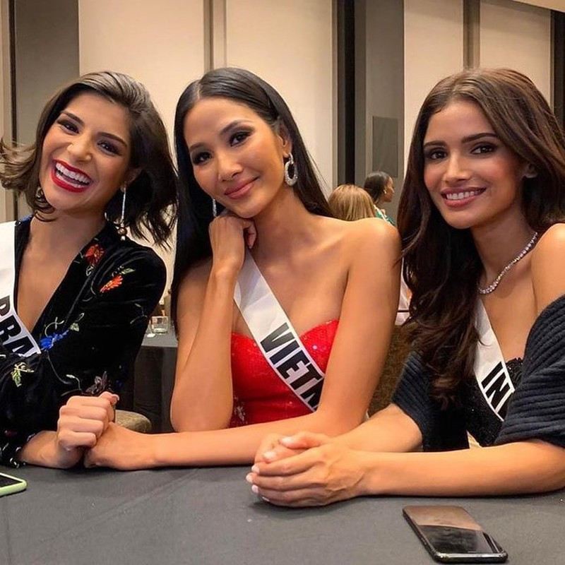 Hoàng Thuỳ nhanh chóng nhập cuộc cùng các thí sinh. Cô có khoảnh khắc 'đọ dáng' cùng Miss Universe Brazil.