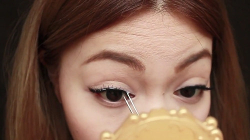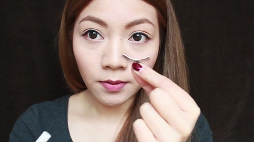 * Bước 3: Dùng hai tay giữ lấy hai đầu mi giả, sau đó uốn lên-xuống nhẹ nhàng để mi được cong tự nhiên hơn. Quết 1 lớp keo vừa đủ, không quá dày lên đường viền của mi giả, đợi 1 lúc cho keo đỡ ướt. Dùng nhíp kẹp lấy mi, sau đó khéo léo ướm vào viền mắt của bạn, bắt đầu dính từ phần giữa, sau đó là phần đầu và cuối mi.