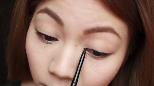 * Bước 1: Chọn mi dày, mỏng tùy ý bạn. Chuẩn bị thêm bút kẻ mắt đen và mascara. Dùng bút kẻ mắt kẻ đường viền thật mỏng theo đúng viền mí trên của mắt, kẹp mi nếu mi thật của bạn chưa cong.