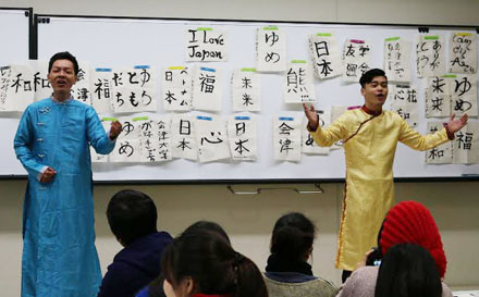 Sinh viên Việt Nam giao lưu và được giáo viên Đại học Aizu dạy thư pháp, nghệ thuật xếp giấy.