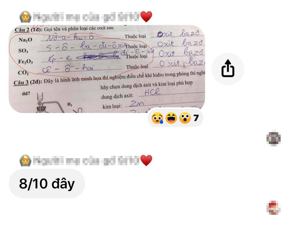 Trong bài kiểm tra môn Hóa lớp 8, khi đề bài yêu cầu gọi tên và phân loại các oxit như Na2O, SO3, Fe2O3, CO2, học trò này đã có cách giải cực kì "bá đạo" mà không ai nghĩ ra được. Thay vì gọi Na2O là Natri Oxit, Fe2O3 là Sắt (III) Oxit, CO2 là Cacbon Dioxit, chủ nhân bài kiểm tra đã nhiệt tình... phiên âm tất cả các chất này sang tiếng Việt.