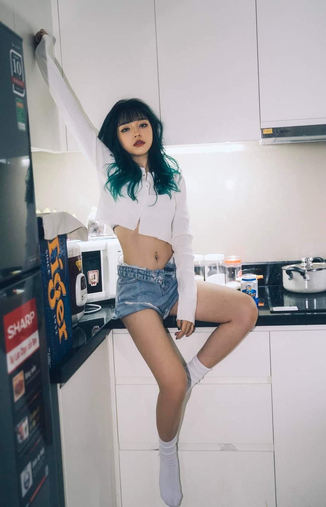 Linh Ngọc Đàm chọn diện quần soóc cùng với áo croptop, áo phông in hình oversized, khoe đôi chân thon thẳng tắp và vòng eo nhỏ đáng ngưỡng mộ.