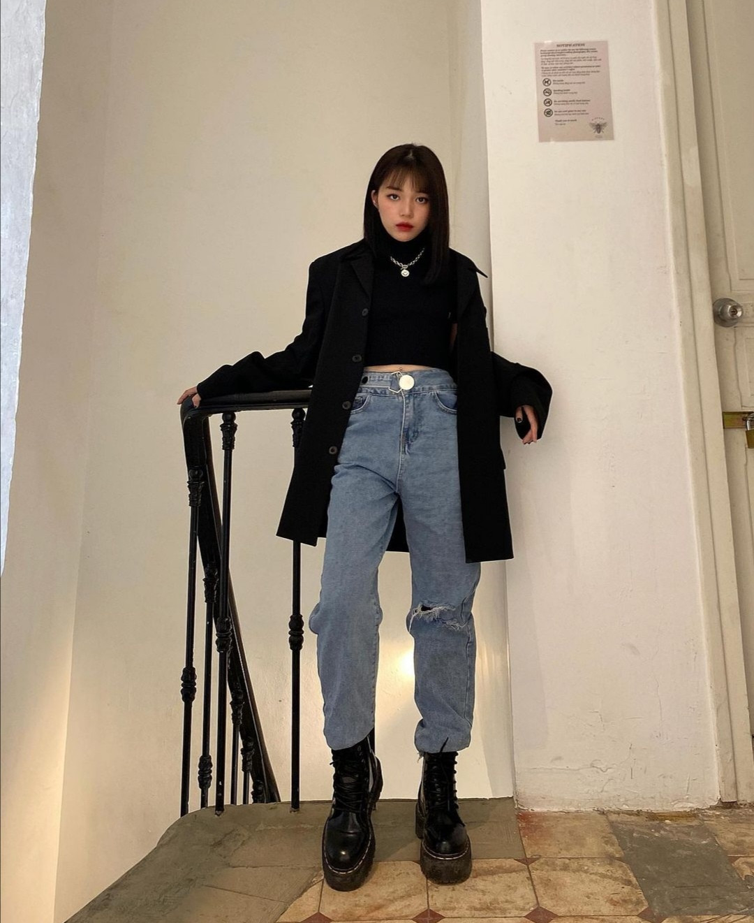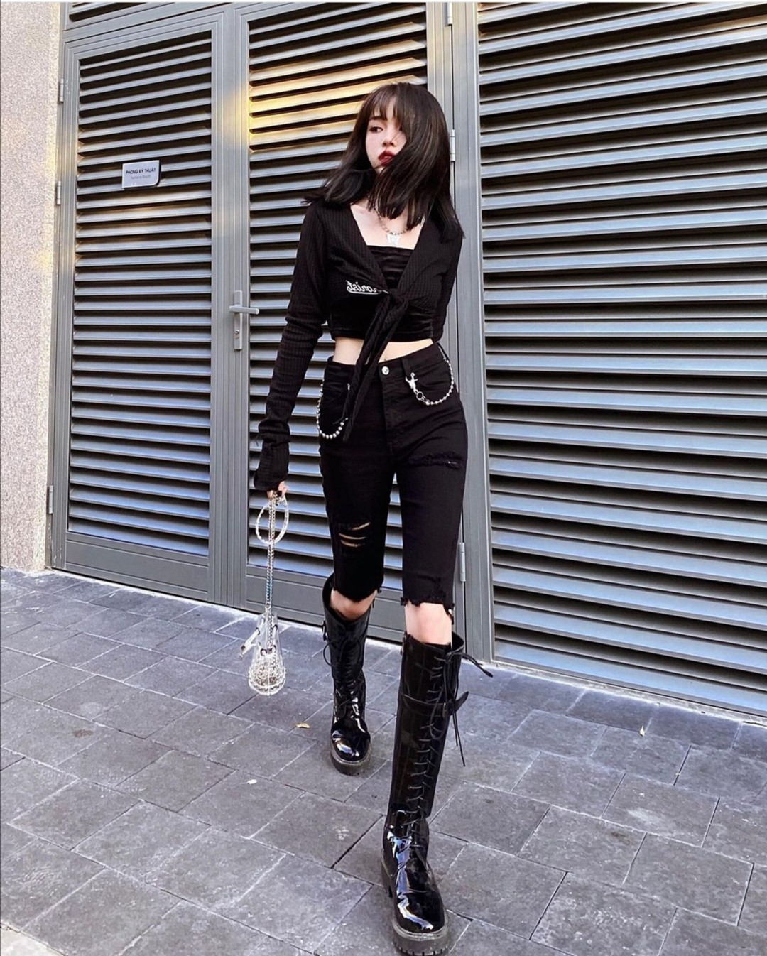 Trang phục màu đen không chỉ giúp che bớt khuyết điểm trên cơ thể của người mặc mà còn giúp bạn nổi bần bật khi lên ảnh nếu mix thêm phụ kiện bắt mắt.