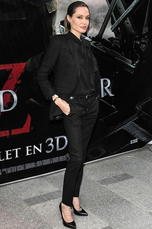 Mặc vest với quần skinny và áo phông như Angie không phải là quá khó, tuy vậy, chọn màu để có vẻ sang trọng lại không dễ. Angie chọn màu đen và nude cho những kết hợp của mình. Phụ nữ trung niên có sở thích mặc sang hay các cô gái muốn tạo vẻ cứng cỏi, thanh lịch cũng có thể học tập Angei.