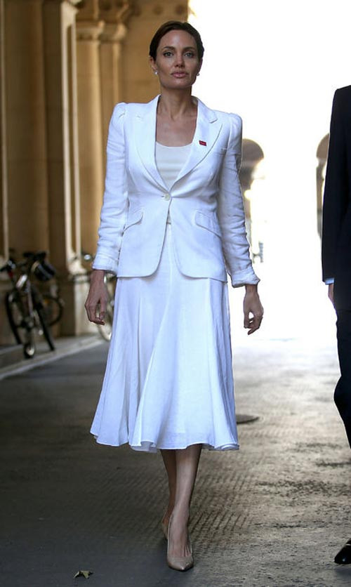 Bộ vest vừa vặn cùng giày cao gót đồng màu tạo nên vẻ gợi cảm và sangtrọng. Angie cũng không quên tạo điểm nhấn với chiếc cổ áo mở, khôngthắt nơ như nguyên mẫu