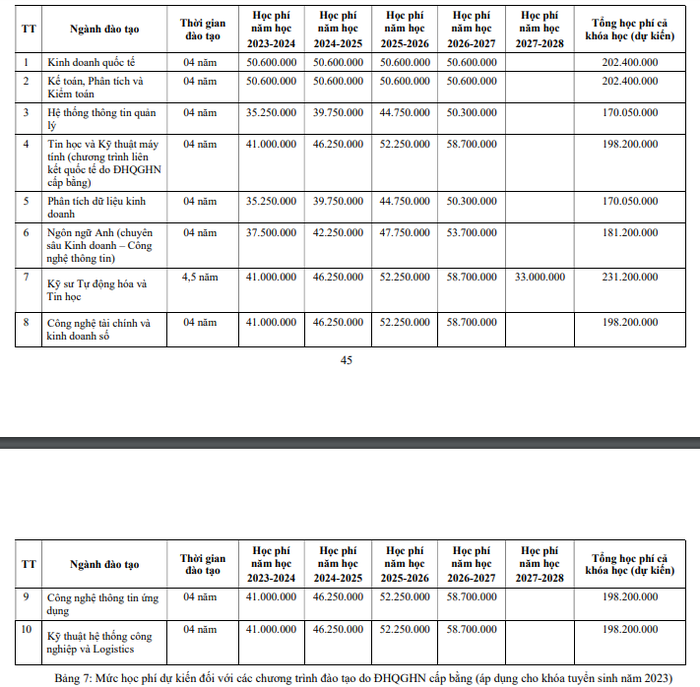 Đối với các chương trình đào tạo do Đại học Quốc gia Hà Nội cấp bằng dự kiến chi phí toàn khóa học (từ năm học 2023-2024 đến năm học 2026-2027) từ 170 triệu đồng cho đến hơn 231 triệu đồng tùy ngành đào tạo.