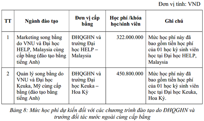 Đối với chương trình đào tạo song bằng do Đại học Quốc gia Hà Nội và trường đối tác cùng cấp bằng sẽ có mức học phí dự kiến toàn khóa là 322 triệu đồng và 450,8 triệu đồng tùy ngành đào tạo.