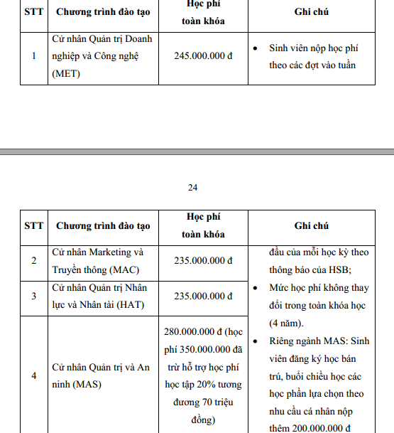 Riêng ngành Quản trị kinh doanh dành cho các tài năng thể thao: Mức học phí dự kiến áp dụng cho khóa tuyển sinh năm 2023: 98 triệu đồng/sinh viên/ khóa học (tương ứng hơn 2,4 triệu đồng/tháng; 770 nghìn đồng/tín chỉ).