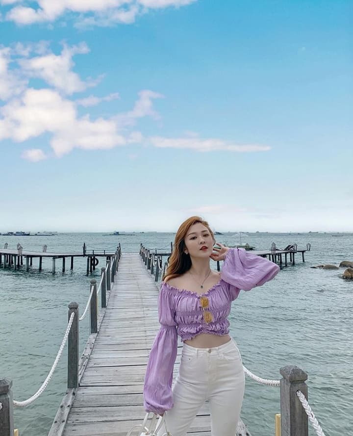 Trẻ trung với áo croptop trễ vai màu hồng và váy midi lưng cao màu tím bơ xinh xắn, thế nhưng nếu không sở hữ "vóc dáng chuẩn" như Amee thì sẽ rất dễ bị "quê" khi phối kiểu này.
