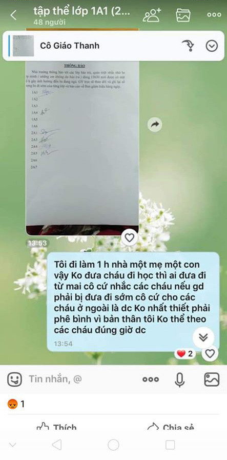 Cô giáo trong câu chuyện trên vì thế đã nhận hàng loạt chỉ trích. Theo bài chia sẻ, trong group phụ huynh của lớp ngay sau khi nhận được tin nhắn phê bình của cô giáo, các phụ huynh đã đồng loạt lên tiếng thể hiện sự bức xúc.