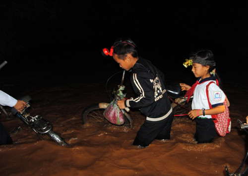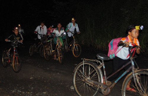 "Những hôm trời mưa, đường trơn lắm, tụi con phải đi học sớm hơn", cô bé nói rồi choàng chiếc đèn pin như của các thợ mỏ lên đầu. Đầu ngõ lúc này đã có tiếng lọc cọc của xe đạp, í ới gọi nhau của nhóm trẻ trong thôn.