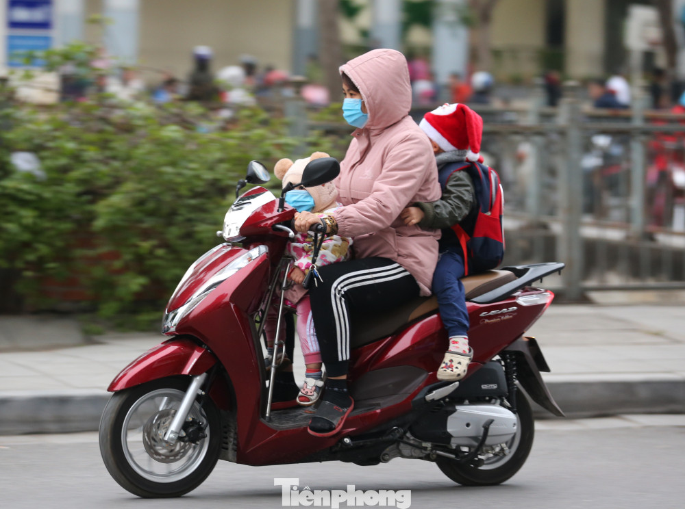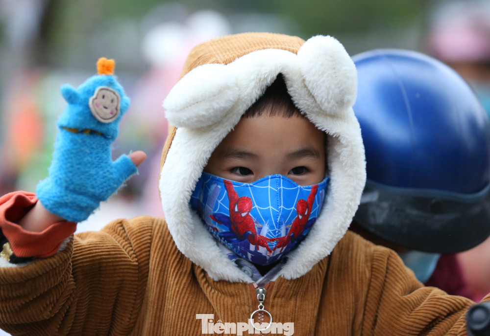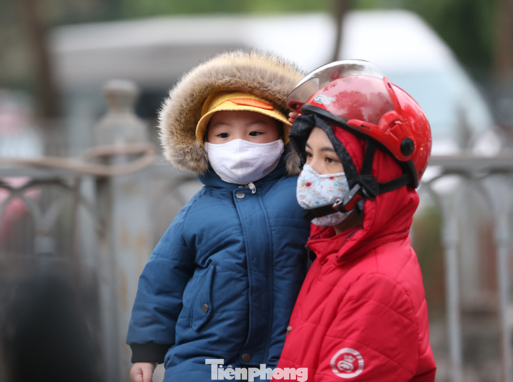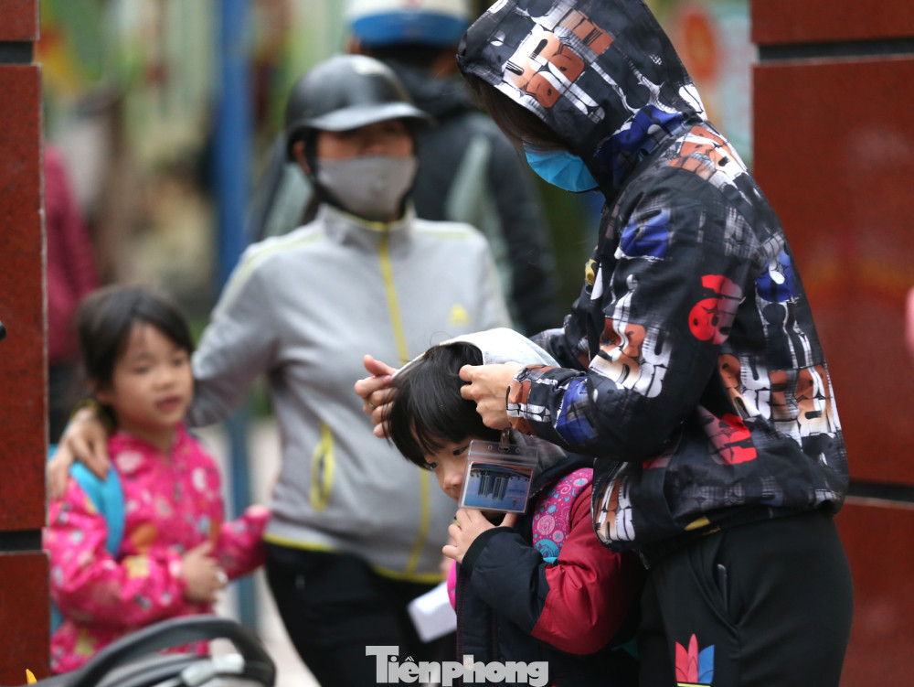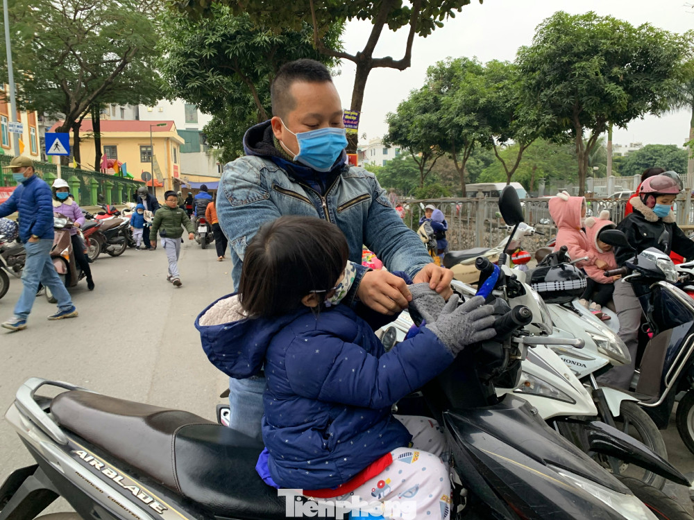 Học sinh đến trường được bố mẹ trang bị áo ấm, găng tay và khẩu trang chống rét.