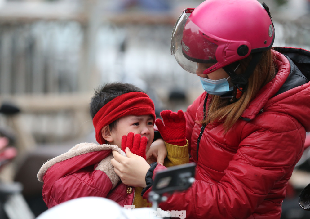 Học sinh và phụ huynh vất vả đến trường trong tiết trời giá lạnh