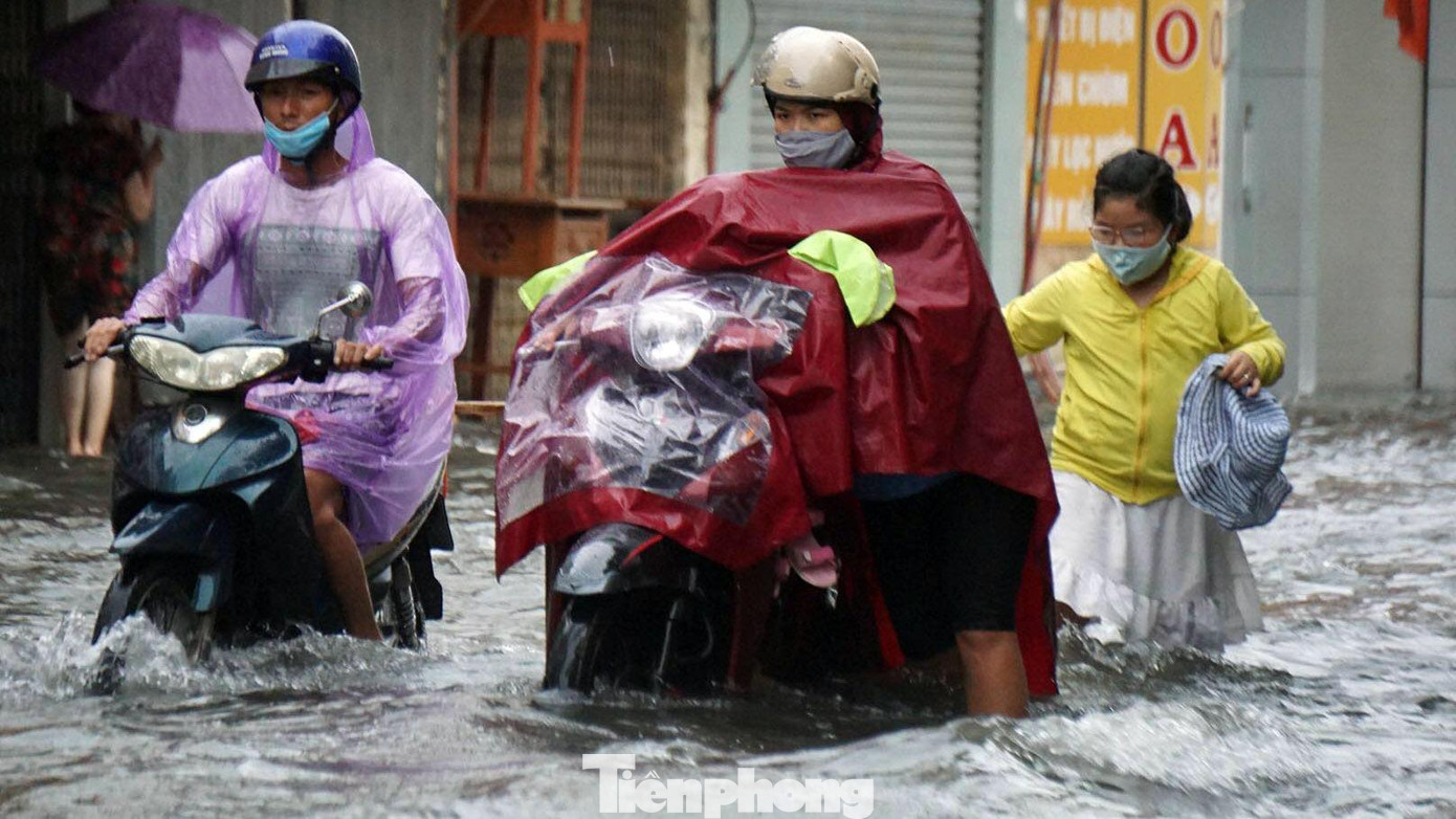 | Xe chết máy, phụ huynh và học sinh lội nước qua phố ngập. |