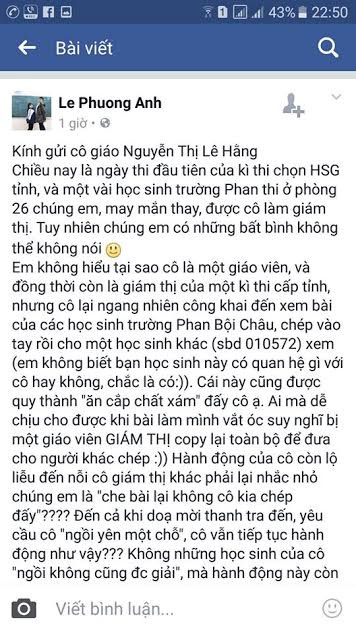 Ngày 14/3, sau ngày đầu tiên trong kỳ thi Học sinh giỏi cấp tỉnh Nghệ An vừa kết thúc ngày thi thứ nhất thì trên mạng xã hội facebook của một học sinh có tên là Lê Phương Anh xuất hiện một “tâm thư” được một học sinh trường Phan Bội Châu (TP Vinh) viết gửi tới cô giáo Nguyễn Thị Lê Hằng – một giám thị coi thi.