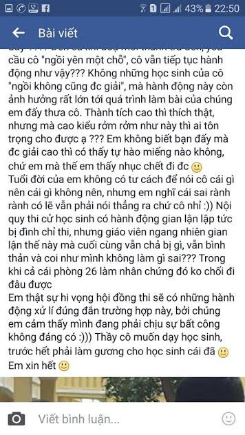 Tuổi đời của em không đủ tư cách để nói với cô cái gì nên hay không nên, nhưng em nghĩ cái sai rành rành có lẽ vẫn phải nói thẳng ra chứ cô nhỉ:)) Nội quy thi cử, nếu học sinh có hành động gian lận lập tức bị đình chỉ thi, nhưng giáo viên ngang nhiên gian lận thế này mà cuối cùng chả bị gì, vẫn bình thản và coi như mình không làm gì sai??? Trong khi tất cả cái phòng 26 làm nhân chứng đó không chối đi đâu được.