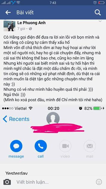 Tuy nhiên, tối ngày 14/3 thì Lê Phương Anh lại tiếp tục có thêm một dòng trạng thái nói lên việc, “cô giáo Hằng” đã điện thoại xin lỗi em. Tuy nhiên, em không đồng tình với việc xin lỗi này, và tạm “đưa” dòng trạng thái vào chế độ “xem một mình”.