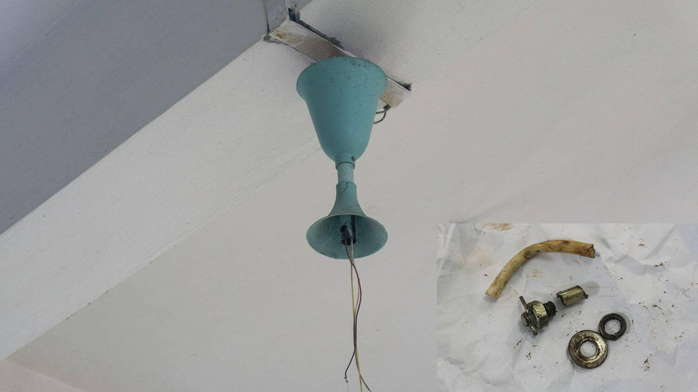 Bước đầu nguyên nhân được xác định do ốc chốt ngang giữa cần quạt và bầu quạt bị gãy làm ba phần, khiến quạt bị rơi. (Ảnh do nhà trường cung cấp)