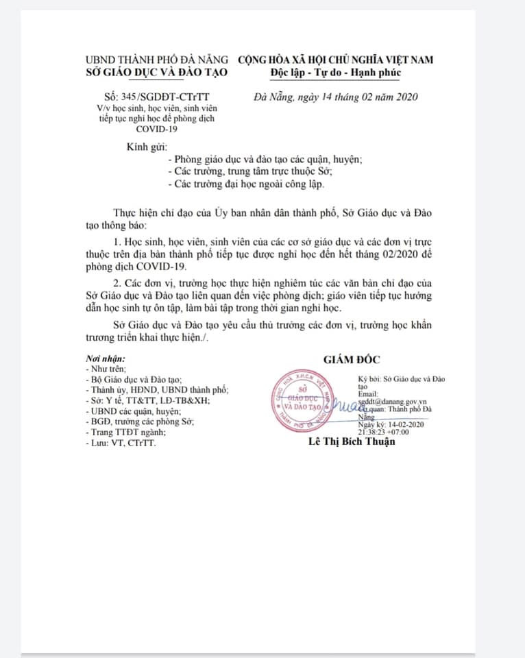 Với học sinh các cấp học còn lại, đến tối ngày 14/2, Sở Giáo dục và Đào tạo Thành phố Đà Nẵng đã có công văn chính thức, thông báo cho toàn thể học sinh, sinh viên của các trường trên địa bàn thành phố nghỉ đến hết tháng 02/2020.