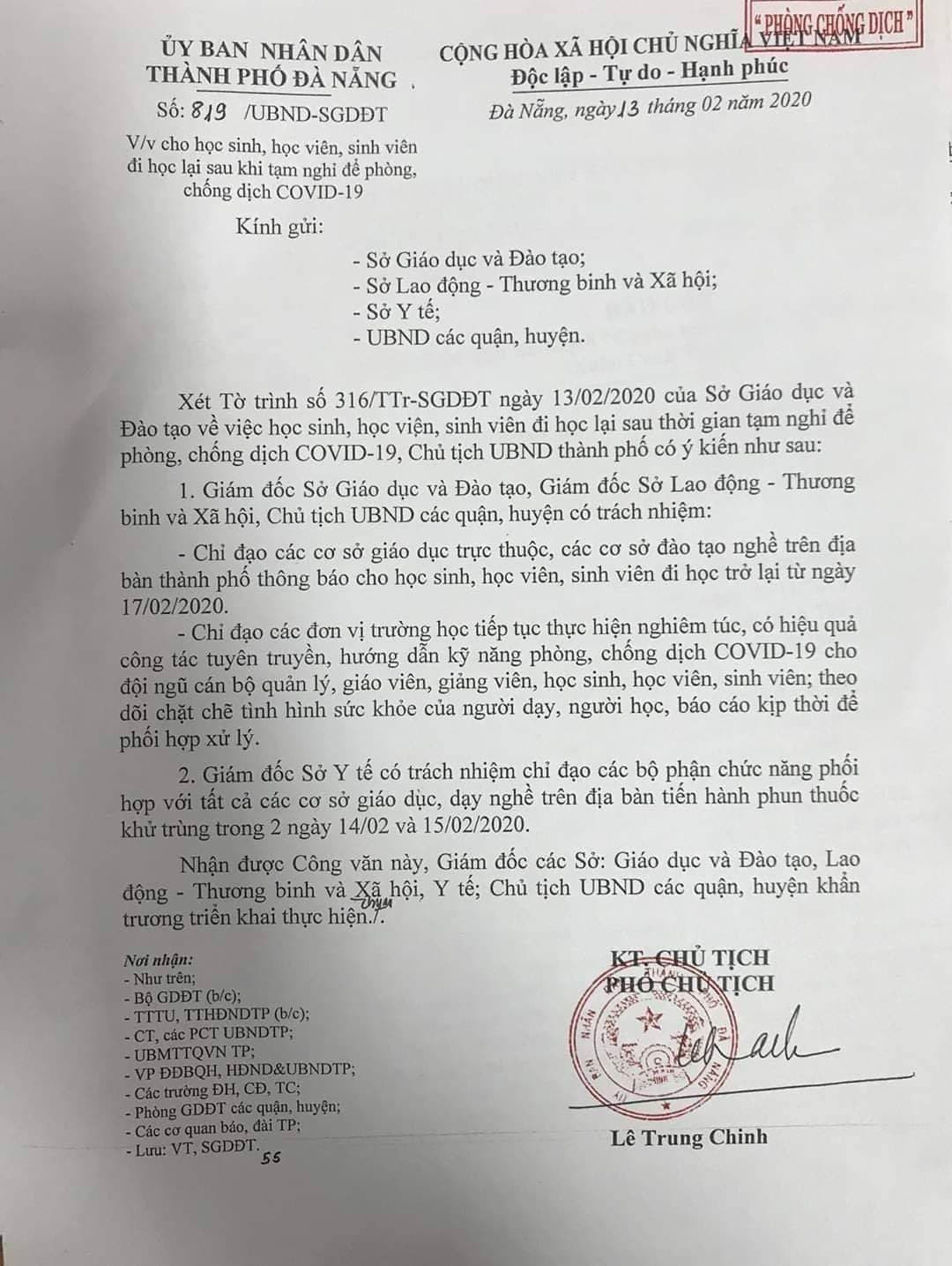 Theo dự kiến ban đầu, vì dịch Corona nên học sinh, sinh viên các Đà Nẵng được nghỉ đến hết ngày 16/02/2020. Hôm qua (13/2), Ủy ban nhân dân Thành phố Đà Nẵng đã có văn bản thông báo học sinh, sinh viên toàn thành phố đi học trở lại từ ngày 17/02/2020.