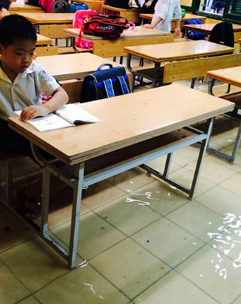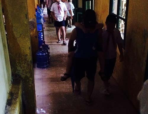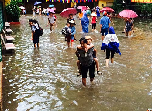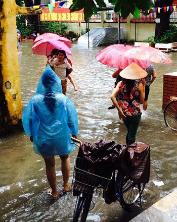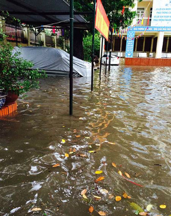 "Sau nhiều lần mặt đường phía ngoài cổng trường được tôn lên thì sân trường học của chúng tôi lại bị trũng đi. Dù hệ thống cống rãnh trong trường luôn được khơi thông nhưng mưa lớn, nước khó thoát nhanh được dẫn đến ngập úng", bà Nga nói.