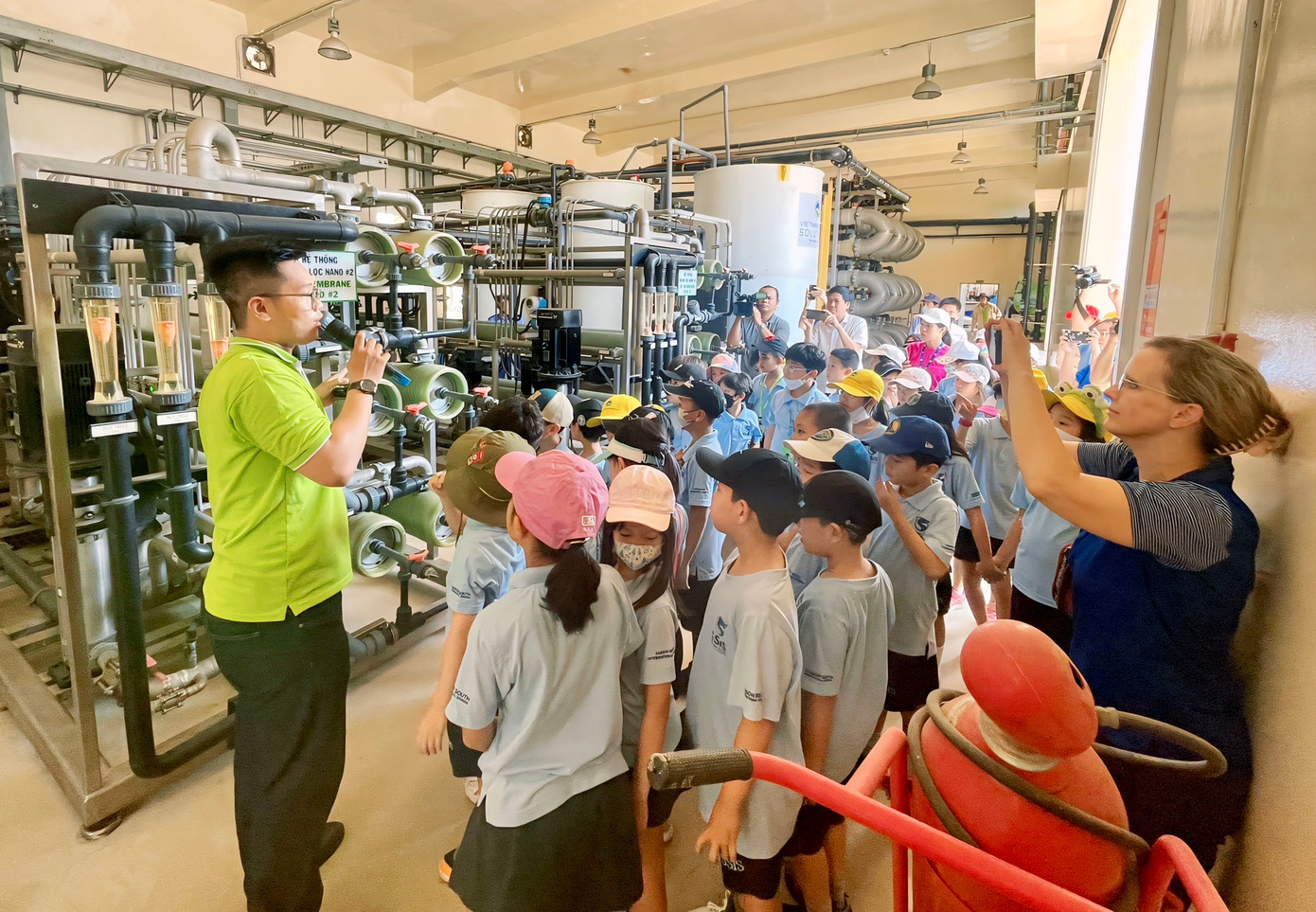 Chăm chú lắng nghe, các em còn đặt nhiều câu hỏi liên quan. Với từng câu hỏi, ông Kevin Moore đều giải đáp tường tận và khuyến khích các em hãy hỏi thật nhiều. Theo đó, mỗi ngày Khu Liên hợp xử lý chất thải Đa Phước tiếp nhận và xử lý khoảng 6.000 tấn rác cho thành phố theo công nghệ chôn lấp hợp vệ sinh của Mỹ. Lượng rác VWS xử lý mỗi ngày chiếm khoảng 70% tổng lượng rác thải mỗi ngày của TPHCM. Một phần quan trọng trong việc xử lý rác của Công ty VWS là tái chế rác thành các sản phẩm như phân compost, phát điện… Sau đó, các em học sinh đã đi tham quan nhà máy xử lý nước rỉ rác tại Công ty VWS.
