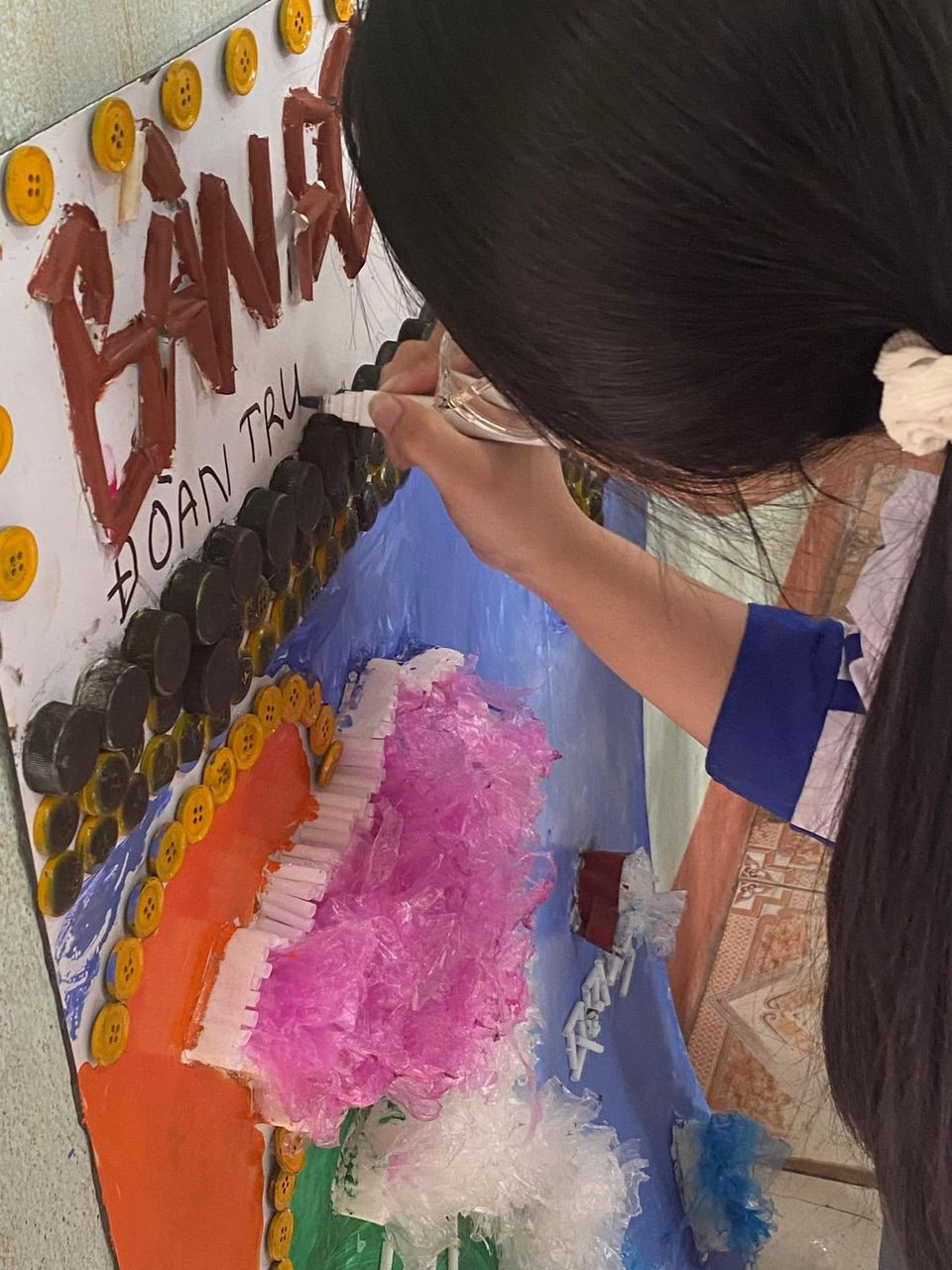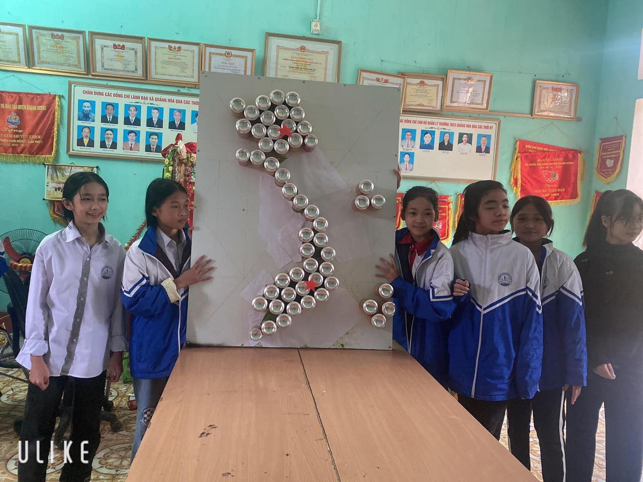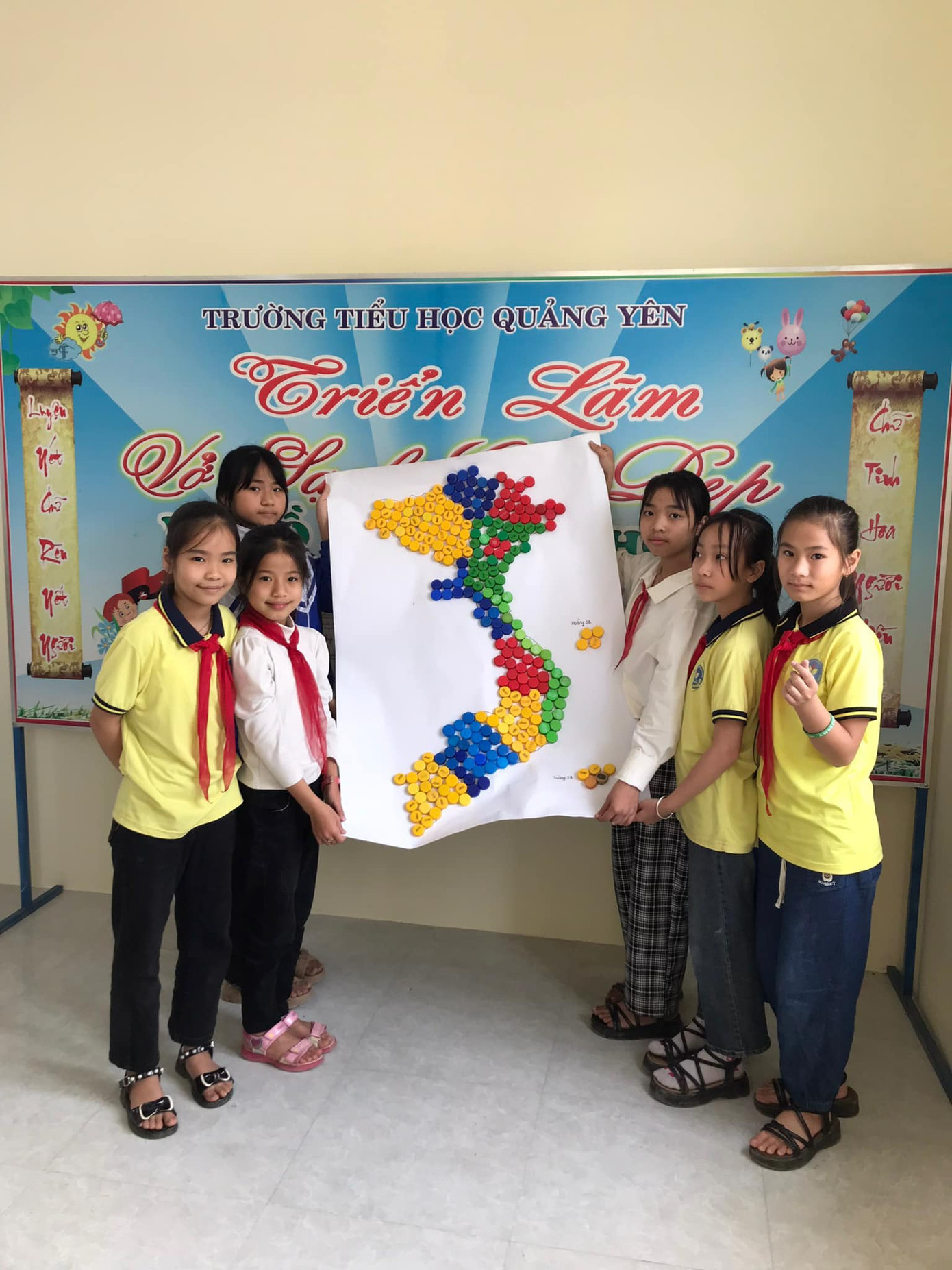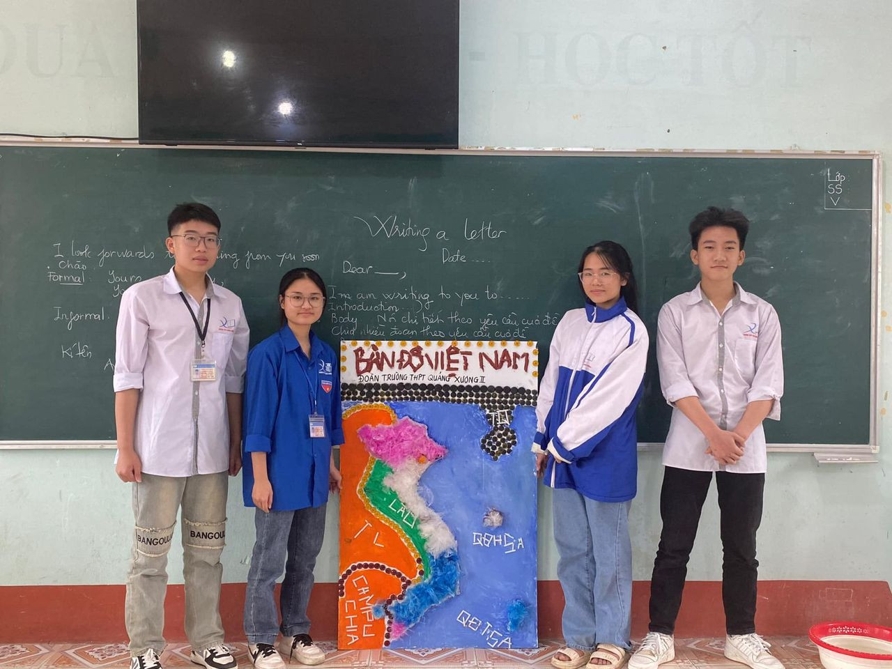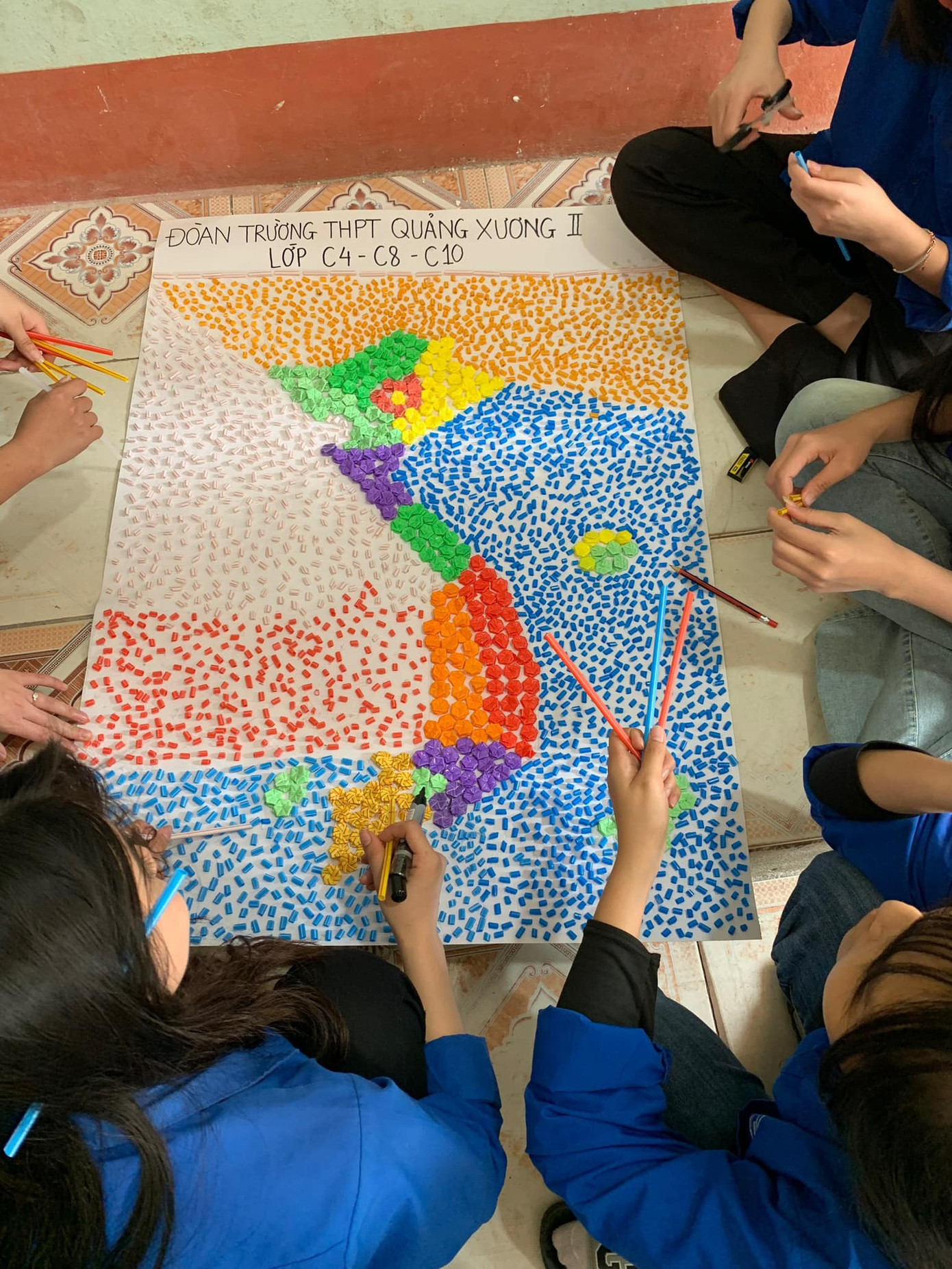 Theo đó, các Liên đội tiểu học, trung học cơ sở, Đoàn trường THPT Quảng Xương II (huyện Quảng Xương, Thanh Hoá) tổ chức sáng chế bản đồ Việt Nam bằng những vật liệu tái chế như: giấy, ống hút, túi nilong, chai nhựa, nắp chai…