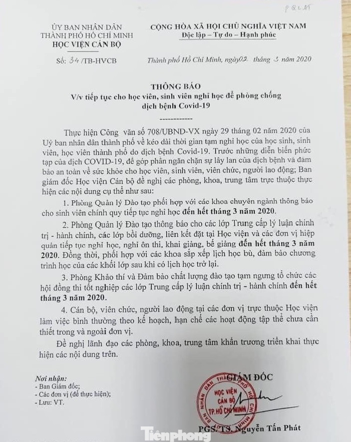 Đồng thời, thông báo cho các lớp trung cấp lý luận chính trị-hành chính, các lớp bồi dưỡng, liên kết tiếp tục nghỉ học, nghỉ ôn thi, khai giảng, bế giảng đến hết tháng 3. Phối hợp với các khoa sắp xếp lịch học bù, đảm bảo chương trình học của các khối lớp sau khi có lịch học trở lại. Cơ sở này hiện có khoảng 2.700 sinh viên.