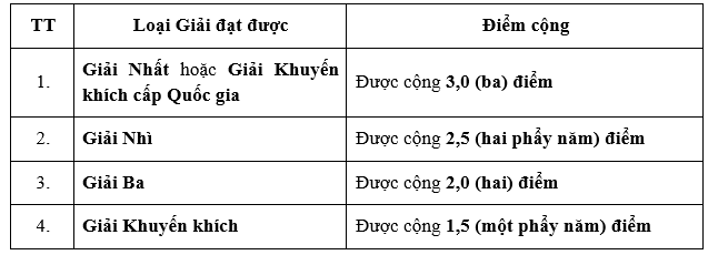 Các thí sinh đạt Giải từ cấp Tỉnh/Thành phố trực thuộc TW trở lên sẽ được cộng điểm ưu tiên xét tuyển vào tổng điểm xét tuyển theo giải thí sinh đạt được như sau: