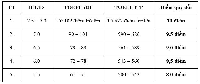 Các chứng chỉ tiếng Anh quốc tế được quy đổi thành điểm môn tiếng Anh khi xét tuyển như sau: