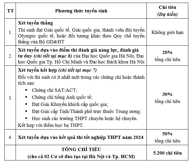 Thí sinh có Chứng chỉ quốc tế SAT, trong thời hạn 02 năm (tính đến ngày xét tuyển) từ 1130/1600 trở lên hoặc ACT từ 25/36 trở lên; và có kết quả điểm trung bình chung học tập lớp 10, 11, 12 hoặc học kỳ 1 lớp 12 (nếu chưa có kết quả năm học lớp 12) đạt từ 7,5 trở lên và có hạnh kiểm Khá trở lên;
