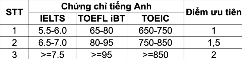 Theo công bố của trường, thí sinh có chứng chỉ tiếng Anh IELTS từ 5.5 hoặc TOEIC từ 650, hoặc TOEFL iBT từ 65 trở lên sẽ được cộng thêm điểm ưu tiên vào điểm xét tuyển chung.