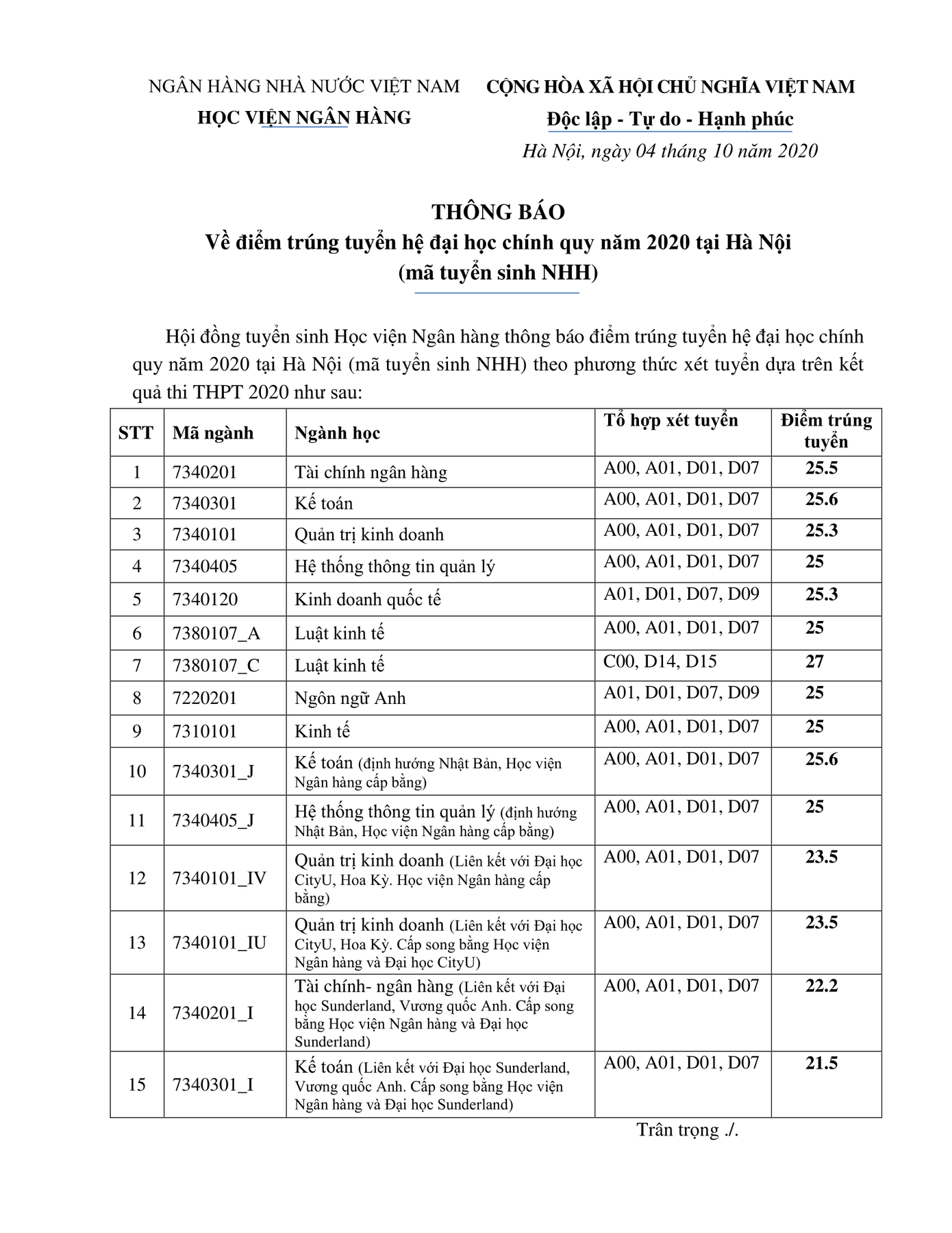 Mức điểm chuẩn cụ thể vào từng ngành của Học viện Ngân hàng năm 2020 như sau:
