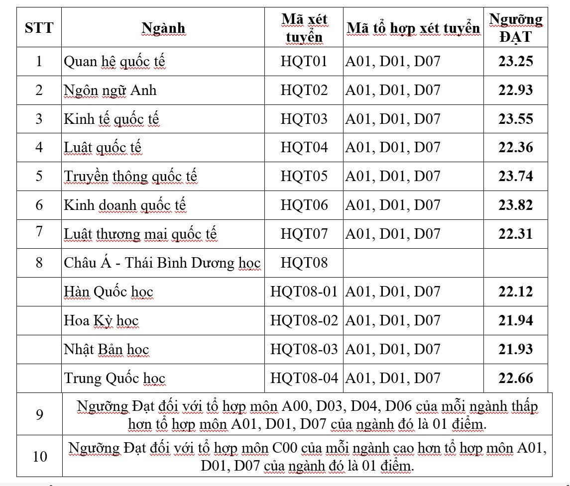 Đối với các ngành Quan hệ quốc tế, Kinh tế quốc tế, Luật quốc tế, Kinh doanh quốc tế, Truyền thông quốc tế, Châu Á - Thái Bình Dương học và Luật thương mại quốc tế: