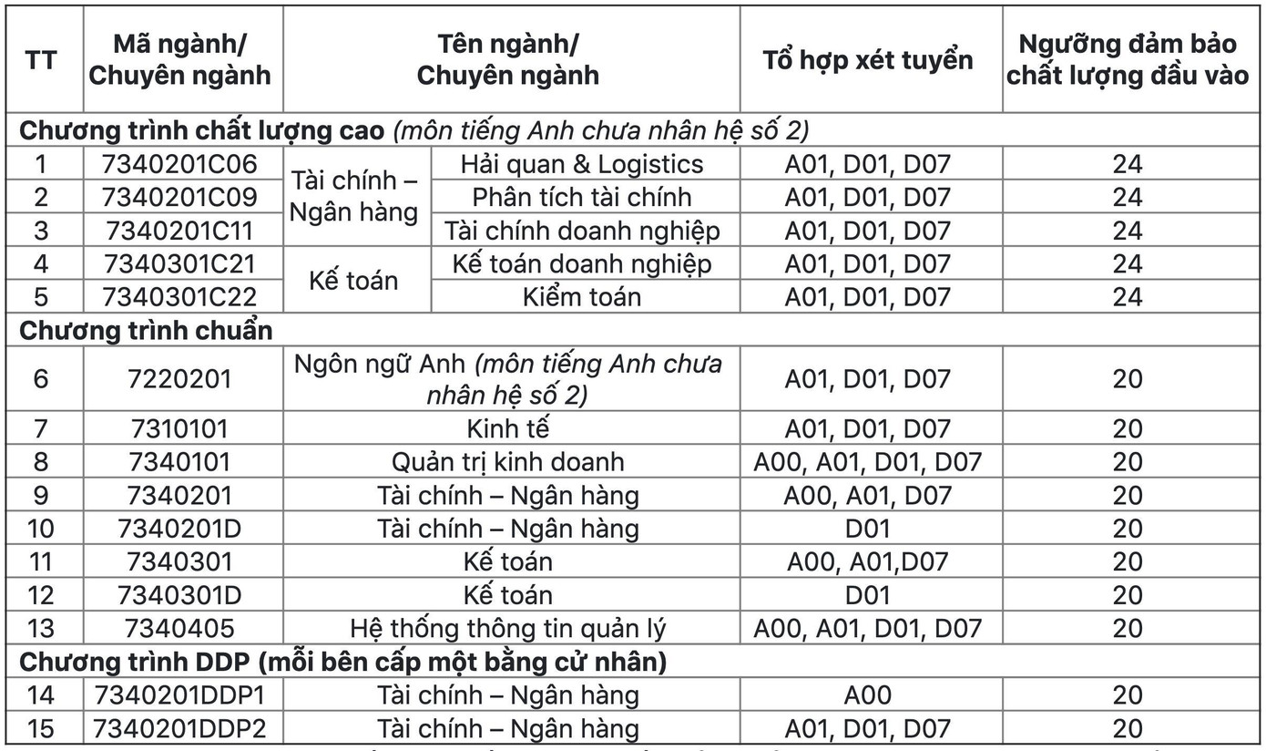 Theo TS Nguyễn Đào Tùng, Phó Giám đốc Học viện Tài chính cho biết, ngưỡng đảm bảo chất lượng năm nay bằng mức năm ngoái là 20 điểm với chương trình chuẩn và 24 điểm 3 môn với chương trình chất lượng cao.