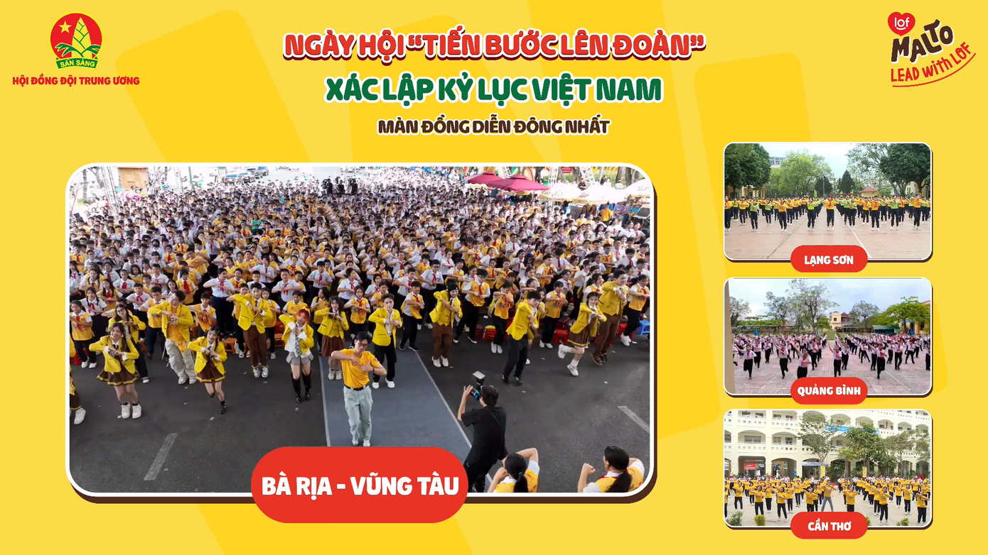 | Tổ chức Kỷ lục Việt Nam (VietKings) xác nhận và chính thức trao Kỷ lục Việt Nam: Ngày hội "Tiến bước lên Đoàn" có số lượng trường trung học cơ sở trên cả nước tham gia màn đồng diễn bài “Tiến bước dưới cờ Đoàn và Lof Malto - Khi nào mình lớn” cùng lúc nhiều nhất Việt Nam. |