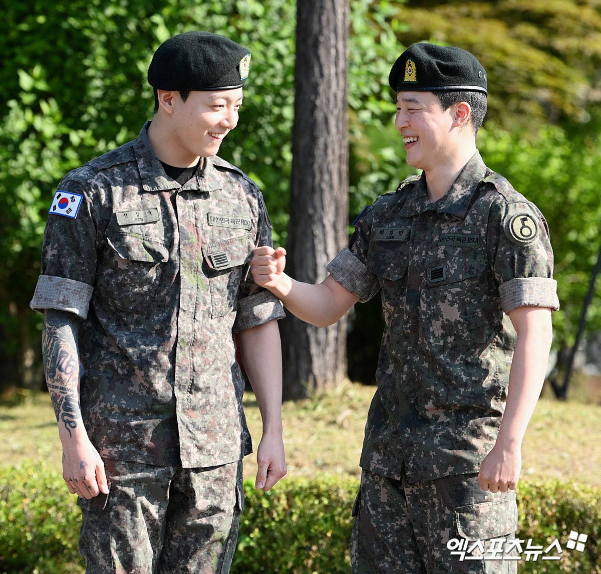 Lễ xuất ngũ của cả hai diễn ra tại tại sân vận động Yeoncheon, tỉnh Gyeonggi (Hàn Quốc). Khoảng 6 giờ sáng (giờ Việt Nam), cả hai xuất hiện với trạng thái tươi sáng, nghiêm túc gửi lời chào điều lệnh các phóng viên và người hâm mộ rồi ngay lập tức trở nên xấu hổ.