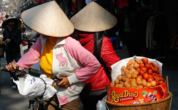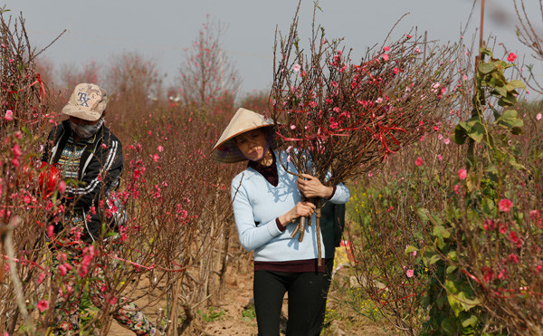Chị Liên, người làng Yên Phụ, mua cành đào tận vườn để đem ra chợ hoa Hàng Lược bán