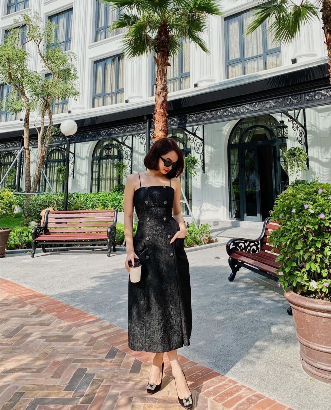 Diện cả cây đen cũng là một ý tưởng không tồi cho các cô nàng sở hữu chiều cao khiêm tốn, Kaity Nguyễn lựa chọn một chiếc váy hai dây dài, mix cùng giày búp bê và kính mát là có ngay set đồ sang chảnh xuống phố.