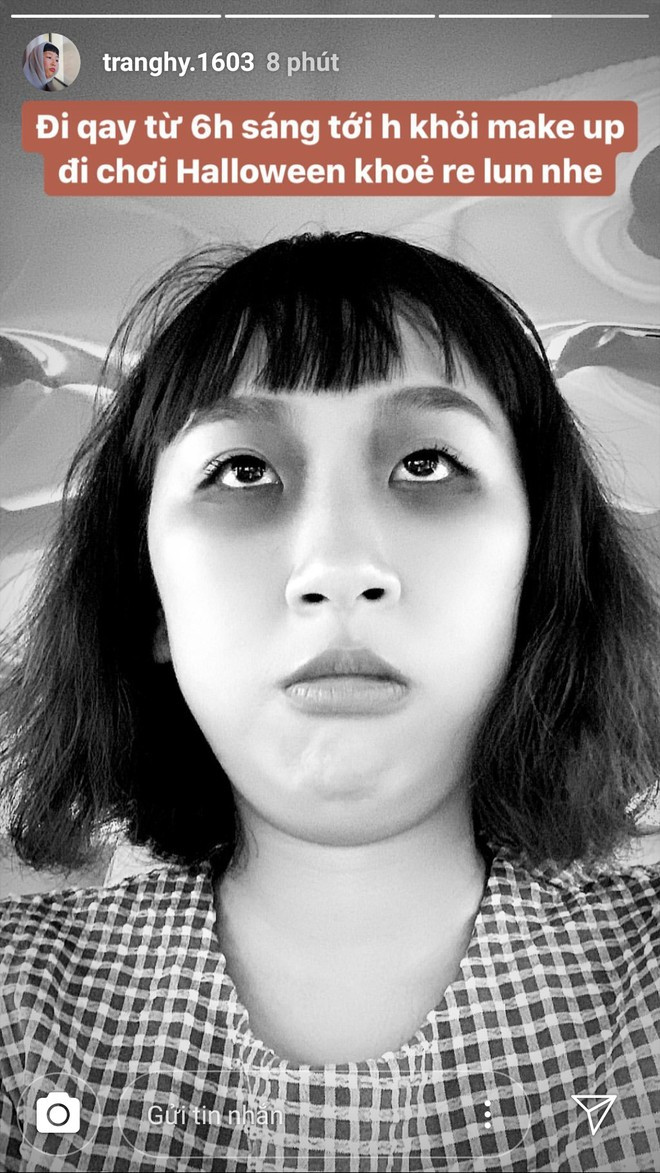 "Thánh lầy" Trang Hý cũng là gương mặt chiếm spotlight ngày Halloween với màn hóa trang nhờ công nghệ của mình. Hot girl 9X hài hước tâm sự với fan mình phải đi quay từ 6h sáng tới tận chiều nên không cần phải make up để đi chơi Halloween nữa. Ảnh chụp màn hình.