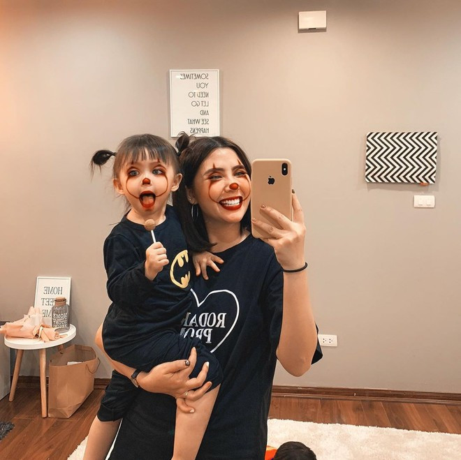 Bà mẹ một con Heo Mi Nhon (Loan Hoàng, sinh năm 1991) đăng bức ảnh cùng cô con gái nhỏ tên Cam hóa trang thành chú hề. Hot girl 9X cùng ông xã Kiên Hoàng và bé Cam là gia đình nổi tiếng mạng xã hội. Ảnh: Instagram NV.