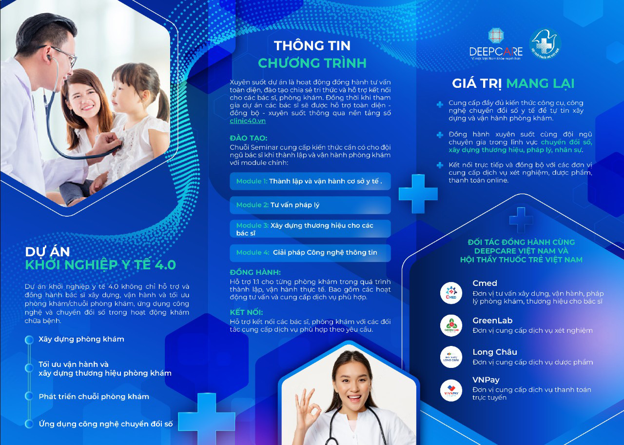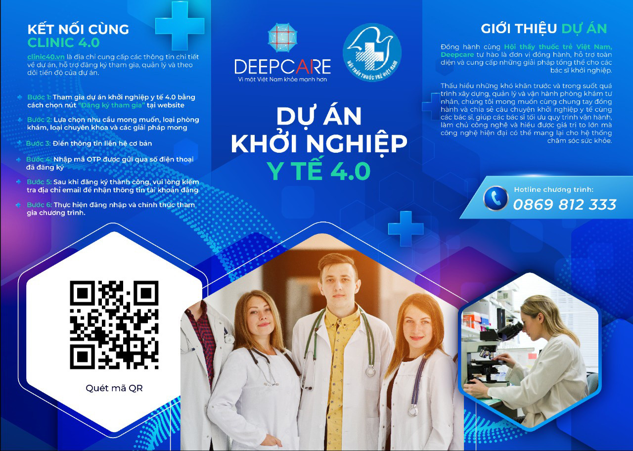 Với dự án “Khởi nghiệp số Y tế Clinic4.0”, Hội Thầy thuốc trẻ Việt Nam phối hợp công ty Deepcare Việt Nam hỗ trợ các y bác sĩ có nhu cầu mở phòng khám tư nhân, khởi nghiệp trong y tế nhưng gặp nhiều khó khăn trong suốt quá trình xây dựng, quản lý và vận hành phòng khám tư nhân.